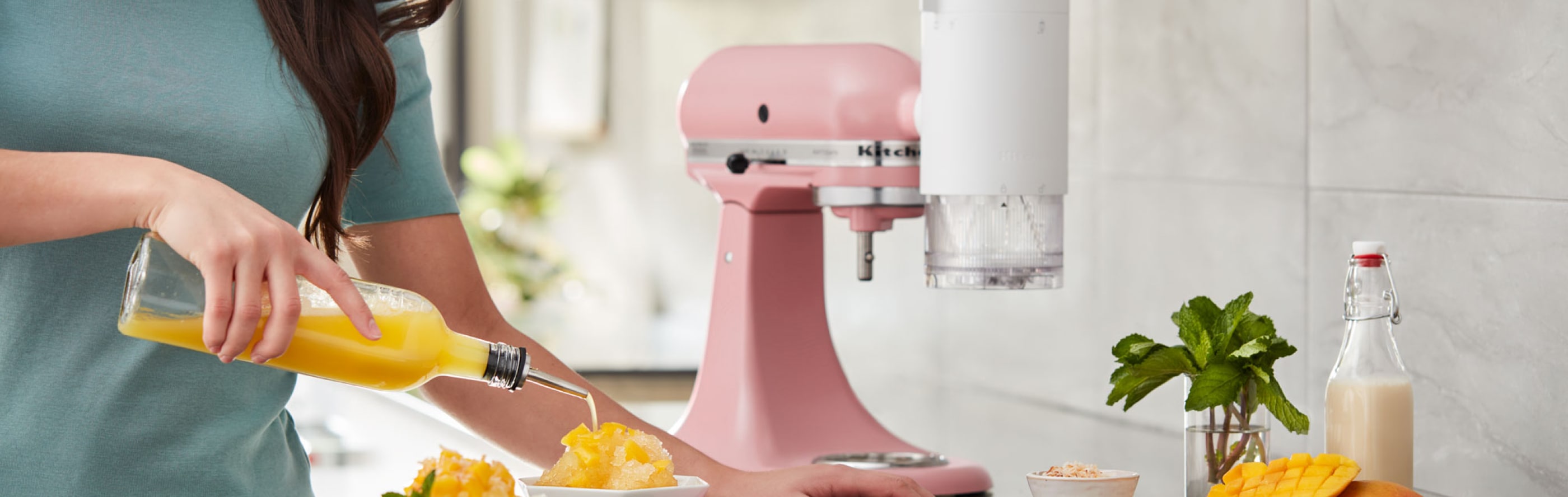 Your KitchenAid® stand mixer with shave ice or ice cream attachments opens the door to sweet possibilities. Whether you want to create frosty treats like Korean bingsu, raspados, sorbet, gelato or frozen yogurt, KitchenAid brand has the stand mixer attachments and accessories to help you satisfy your sweet tooth.