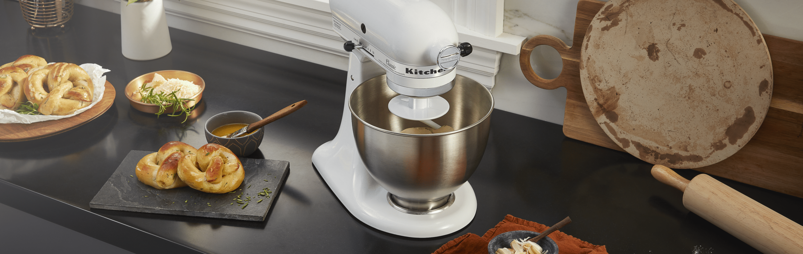 Basic soft pretzels provide the perfect canvas for creating unique flavor and topping combinations. Read the stand mixer pretzel recipe below to discover 12 steps for making a quintessential homemade soft pretzel, and learn tips that can help you achieve the color, texture and flavor combinations you want. Use a KitchenAid® stand mixer to mix and knead in the same bowl and cut down on manual kneading time when you use the included KitchenAid® Dough Hook Accessory.