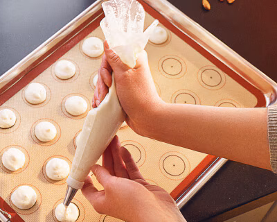 Put the mixture in a pastry bag with a large straight tip and pipe 1-inch balls onto a parchment-lined baking sheet. After piping each ball, wet the tip of your finger and even out the tops where the dough was released from the pastry bag. Make sure the balls are placed at least 1 inch away from each other, as they’ll puff up during baking.